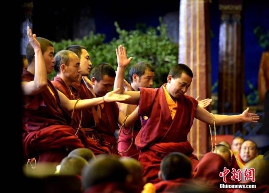 ?4月5日,來自格魯派各大寺廟的僧人們向獲得格西拉讓巴學(xué)位的僧人提出問題進(jìn)行答辯。中新社發(fā) 李林 攝