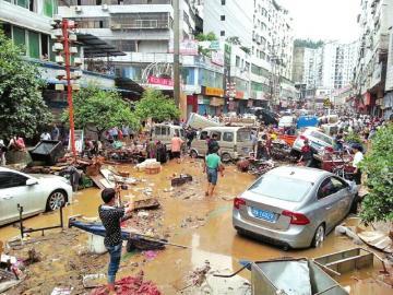 下午5時許,縣城雨量變小,洪水逐漸消退,剛剛遭遇洗劫的上河街一片狼藉,地面淤泥厚達(dá)10余厘米,家具、冰箱、車輛等將整條街道全部阻塞。