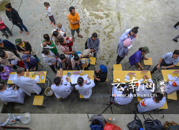 6月3日早上九點(diǎn),醫(yī)療隊(duì)的二十多位專家來到了獨(dú)龍江巴坡村,在當(dāng)?shù)卮逦瘯?huì)的門前搭起了簡易醫(yī)院。幾張桌子,幾條板凳構(gòu)成了這個(gè)臨時(shí)的“云南省第一人民醫(yī)院”。還沒等所有的設(shè)備準(zhǔn)備好,就有村民前來體檢就診。隨著時(shí)間的推移,越來越多的村民聚集到了這塊半個(gè)籃球場大的小廣場上,有的還是專門騎摩托車從別的地方趕來的。