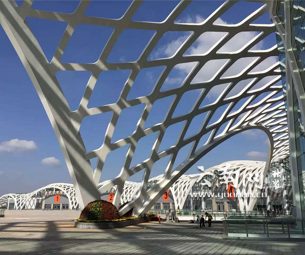 南博會主場館鋼結(jié)構(gòu)工程最大跨度104米,最高34米,最大分片重30噸,總用鋼量1.1萬余噸,分為外弧網(wǎng)格、邊網(wǎng)格、內(nèi)弧網(wǎng)格三部分。外弧網(wǎng)格的14個弧拱與內(nèi)弧網(wǎng)格13個弧拱,加上兩端各2個邊網(wǎng)格弧拱,將13個展館包攏。其中內(nèi)弧網(wǎng)格最高拱處設(shè)主序廳,為展館主入口。主序廳幕墻懸掛在30根樹形鋼柱上,樹形柱因受力較大,采用Q420級高建鋼。廳內(nèi)樹立2個巨大的花瓶柱,花瓶柱高24米,每個花瓶柱由123個鋼構(gòu)件拼裝而成,每個柱體重達163噸,花瓶柱的彎扭程度亦屬云南之最?;ㄆ恐w與主序廳頂網(wǎng)格完美相接,廳頂網(wǎng)格緊扣設(shè)計理念,呈現(xiàn)出孔雀翎羽的別致效果,且可透視天空。