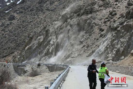 4月26日15時(shí)25分,尼泊爾發(fā)生7.1級(jí)地震,西藏日喀則市聶拉木縣震感強(qiáng)烈。正在距離聶拉木縣5公里執(zhí)行318國(guó)道疏通任務(wù)的兩位民警險(xiǎn)些被余震震落的滾石擊中。318國(guó)道路邊地面出現(xiàn)近10公分裂縫。中新社發(fā)鄭永波攝