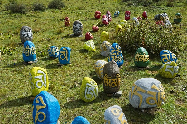 碧綠的草地上是五彩斑斕刻有經(jīng)文的石塊,為苦行的生活點(diǎn)綴上些許色彩。(來自:騰訊新聞編譯)