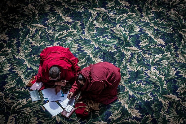 僧人們正伏在刺花的地毯上學(xué)習(xí)課程。這里的佛學(xué)院對外開放,歡迎游客們參加到學(xué)習(xí)之中,一覽僧人們的日常。(來自:騰訊新聞編譯)