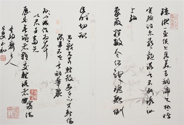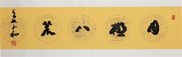 他沉緬于書(shū)法情趣之中又能夠自拔。力圖在這個(gè)領(lǐng)域有所探索,多少搞出一點(diǎn)自己的名堂,如內(nèi)容、布局、色彩上創(chuàng)新的想法,卻不悖于法理。由于他堅(jiān)執(zhí)以書(shū)法來(lái)書(shū)寫(xiě)自己的心跡與追求,可能沒(méi)有通常書(shū)家的市場(chǎng)效應(yīng),卻在曲高和寡中保持了藝術(shù)的矜持。
