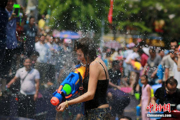 圖為4月15日,一名外國美女在潑水狂歡中遭到眾人“祝福”。 中新社發(fā) 郝亞鑫 攝 圖片來源:CNSPHOTO