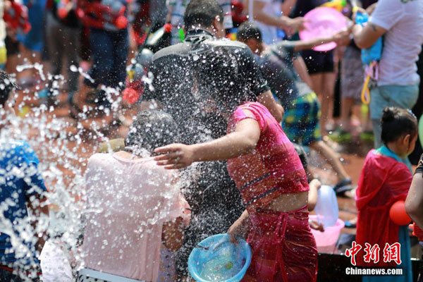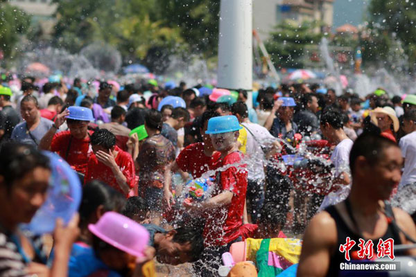 2015年4月15日,云南省西雙版納傣族自治州,當(dāng)是2015年西雙版納潑水狂歡節(jié),也是傣歷1377年新年節(jié)系列活動之一,數(shù)萬名當(dāng)?shù)厝罕姶┥瞎?jié)日盛裝,和外地游客一起在云南省西雙版納傣族自治州景洪市潑水廣場互相潑水,互祝吉祥、幸福、健康。潑水節(jié)是傣族人民送舊迎新的傳統(tǒng)節(jié)日,已有上千年歷史。圖為4月15日,人們在景洪市潑水廣場參加潑水狂歡活動。中新社發(fā)郝亞鑫攝圖片來源:CNSPHOTO