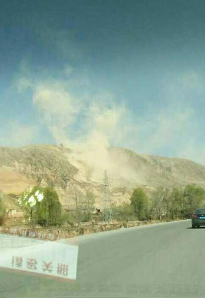 中國地震臺網(wǎng)中心發(fā)布,2015年4月15日15時08分36秒,甘肅省定西市臨洮縣發(fā)生4.5級地震(緯度35.4°、經(jīng)度104.0°),深度達(dá)9千米,周邊百公里左右的城市臨夏、蘭州等震感強(qiáng)烈。據(jù)當(dāng)?shù)厝罕娊榻B,地震發(fā)生時感覺晃動的非常厲害,緊接著就能聽到巨大的響聲,如同炸山放的炮,有局部地方出現(xiàn)滑坡。圖片為當(dāng)?shù)厝罕娪檬謾C(jī)拍攝到的地震發(fā)生后的一些場景。