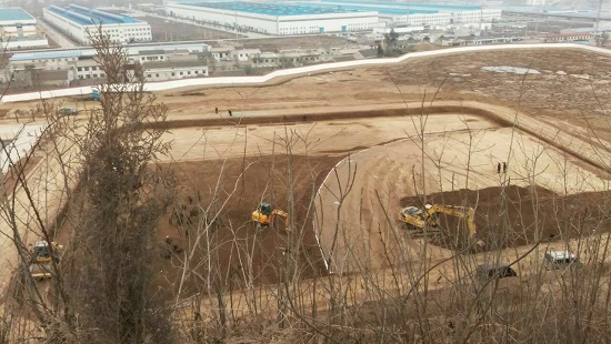 隨后,記者來到寶雞市高新區(qū)八魚鎮(zhèn)范家崖村施工現(xiàn)場(chǎng)進(jìn)行查看。百余畝的土地上幾臺(tái)大型工程車輛正在施工,旁邊還有人員拉著水管在降塵,一個(gè)據(jù)說是魚池的大池已經(jīng)蓄滿了水,現(xiàn)場(chǎng)沒有任何工程指示標(biāo)志。
