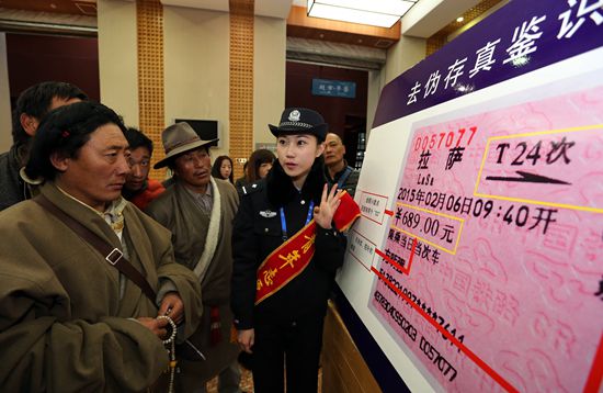 拉薩鐵路公安處民警黃立為旅客講解如何辨別真假火車票。 胡傳鑫 攝