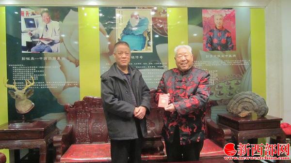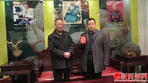 世界彭氏宗親聯(lián)誼總會(huì)副總會(huì)長、陜西武盾實(shí)業(yè)(集團(tuán))公司董事長、陜西彭祖養(yǎng)生文化研究會(huì)會(huì)長、陜西川渝商會(huì)常務(wù)副會(huì)長、西安四季華庭酒店董事長彭亭彬(右)被陜西省養(yǎng)生協(xié)會(huì)聘請為研究員。2015年2月3日,陜西省養(yǎng)生協(xié)會(huì)會(huì)長卜廣民(左)向彭亭彬董事長頒發(fā)證書。新西部網(wǎng) 王順利攝