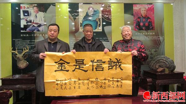 卜廣民會(huì)長(中)向彭亭彬董事長(左一)、彭銘泉教授贈(zèng)送書法作品。新西部網(wǎng) 王順利攝