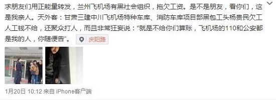 1月20日,網(wǎng)友@可樂戒指控發(fā)微博稱,蘭州中川機場一包工頭拖欠工人工資,還聚眾打人,并叫囂“就是不給你們算賬,飛機場的110和公安都是我的人,你隨便告”。