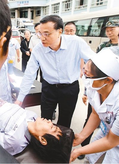 魯?shù)榭h人民醫(yī)院是離震中最近、實(shí)力較強(qiáng)的醫(yī)院,已收治了280多名傷員包括重傷員。醫(yī)院門前廣場設(shè)置了傷員分診臺(tái),李克強(qiáng)詳細(xì)詢問傷員收治、分診和轉(zhuǎn)運(yùn)情況。這時(shí),救護(hù)車又送來一名傷員,李克強(qiáng)俯身察看傷情,安慰他說,到醫(yī)院就好了,醫(yī)護(hù)人員一定有辦法把你治好。
