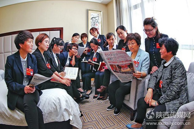 5月9日,省第十三次黨代會間隙,寶雞代表團的女代表在房間內(nèi)認真討論報告。