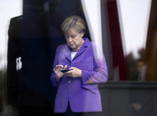 圖為德國柏林,德國總理默克爾在等待波蘭總理到訪時一直低頭看手機。圖片來源:環(huán)球網(wǎng)