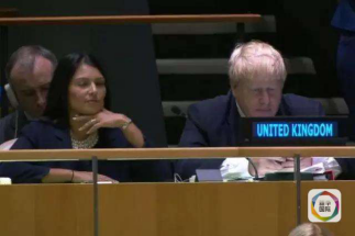 英國外交大臣鮑里斯·約翰遜在聯(lián)合國大會上玩手機,當(dāng)時他的頂頭上司——英國首相特雷莎·梅正在發(fā)言。圖片來源:新華網(wǎng)