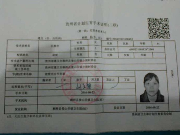 圖片說明:呂女士的計(jì)劃生育手術(shù)證明。