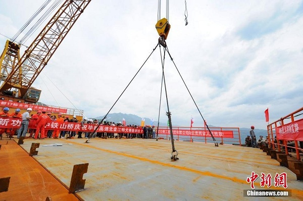 北盤(pán)江大橋最后一塊橋面板安裝完畢。中新社記者 賀俊怡 攝 (來(lái)自:中新網(wǎng))