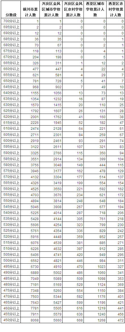 興慶區(qū)、金鳳區(qū)城市普通高中(銀川一中、銀川二中、銀川九中、銀川唐徠回民中學(xué)、銀川六中、銀川市實(shí)驗(yàn)中學(xué)、銀川高級(jí)中學(xué)、寧夏長(zhǎng)慶高級(jí)中學(xué))最低錄取控制線為556分;