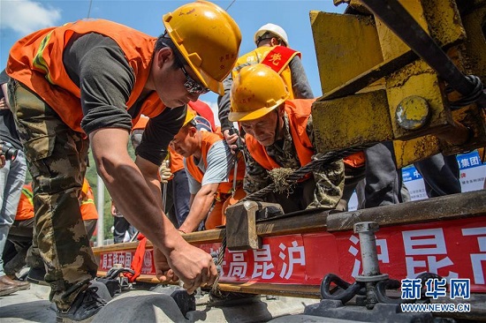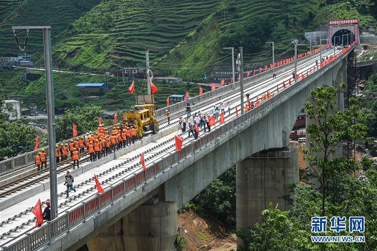 5月31日,鋪軌車在施工現(xiàn)場鋪設(shè)軌道。