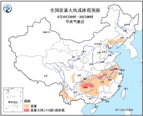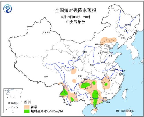 預計4月19日08時20日08時,云南西部和南部、貴州北部和東部、湖南北部、湖北南部、江西北部、安徽西南部、廣西東部、廣東西南部等地的部分地區(qū)有短時強降水天氣,小時雨強20-50毫米,最強可達70mm/h。此外,貴州北部和東北部、湖南西北部、河北與內(nèi)蒙交界處的局地可能伴有8-9級雷暴大風;貴州北部局地有冰雹。