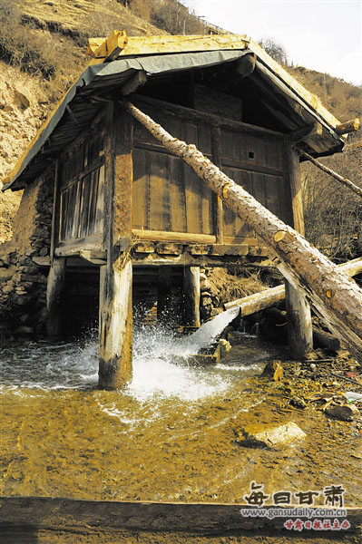 甘南是牧區(qū),何以在牧歌中出現(xiàn)水墨這樣的田園意味?回來(lái)查找資料,畫(huà)中的水磨群位于甘南藏族自治州迭部縣的多兒鄉(xiāng)洋布村。而之所以能成為畫(huà)中之景,又一下子抓住了記者的眼光,不僅僅是因?yàn)檫@處水磨群獨(dú)特的風(fēng)景,更獨(dú)特的是因?yàn)?,時(shí)至今日,當(dāng)?shù)氐娜藗円琅f在使用著這些水磨。