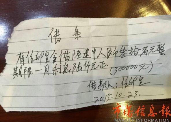 在一張時間為2015年10月23日的借條中,內容顯示“任卯生今借陸建中人民幣叁拾萬元整,期限一個月利息陸千元整,借款人任卯生”。陸家寨四組組長任卯生解釋,“村書記陸建中讓村干部帶頭入股‘陸陸順公司’,每股叁拾萬元,由于手頭緊張,所以就向村書記借了叁拾萬元,當月二分的利息?!薄按謇锝桢X的人挺多的,放貸總額達到800萬元”旁邊的任慶利補充說。
