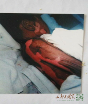 2014年2月12日,劉洋因?yàn)楦忻案邿驮\于榆林一診所,被診斷為皮疹。一天后仍然高燒不退,于2月14日以“急性化膿性扁桃體炎皮疹待查”入住榆林市第一醫(yī)院小兒科,入院診斷為葡萄球菌性燙傷皮膚綜合征;急性化膿性扁桃體炎;大皰性表皮壞死性松懈型藥疹,住院8天后劉洋在媽媽的強(qiáng)烈要求下轉(zhuǎn)院了,于2014年2月21日以“全身紅斑、水皰伴發(fā)熱10天”入住于第四軍醫(yī)大學(xué)唐都醫(yī)院。根據(jù)唐都醫(yī)院住院病例記載:劉洋以“SSSS”入住榆林市第一醫(yī)院住院,住院期間給予“能量合劑、頭孢替安等藥物”,未能控制病情,一天后改用甲強(qiáng)龍80mg靜滴,并給予免疫球蛋白等藥物靜滴,皮損繼續(xù)加重,全身皮膚出現(xiàn)大皰,并多處潰爛,體溫最高41℃,且伴有便血。??魄闆r為:全身表皮剝脫,可見大小不等的松弛性水皰,大皰破潰、局部形成糜爛,背部及臀部等受壓部位表皮剝脫明顯,并有表皮壞死,血性及漿液滲出較多,觸痛明顯。眼瞼、口腔粘膜、外耳道及外陰等腔口部位均糜爛、破潰。