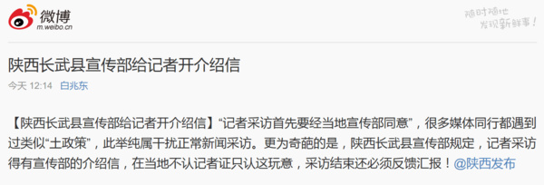#奇葩#【陜西縣宣傳部給記者開介紹信】“記者采訪首先要經(jīng)當(dāng)?shù)匦麄鞑客狻?,很多媒體同行都遇到過(guò)類似“土政策”,此舉純屬干擾正常新聞采訪。更為奇葩的是,陜西長(zhǎng)武縣宣傳部規(guī)定,記者采訪得有宣傳部的介紹信,在當(dāng)?shù)夭徽J(rèn)記者證只認(rèn)這玩意,采訪結(jié)束還必須反饋匯報(bào)?