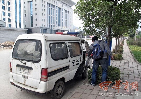 對(duì)面檢察院門(mén)衛(wèi)室一男子稱(chēng),這輛警車(chē)停這里至少有幾個(gè)月了。山陽(yáng)縣司法局新辦公大樓緊鄰檢察院,經(jīng)記者證實(shí),這輛警車(chē)屬山陽(yáng)縣司法局公車(chē),之前歸縣司法局寬坪司法所使用,2011年6月底有效期截止,屬于逾期未檢驗(yàn)。