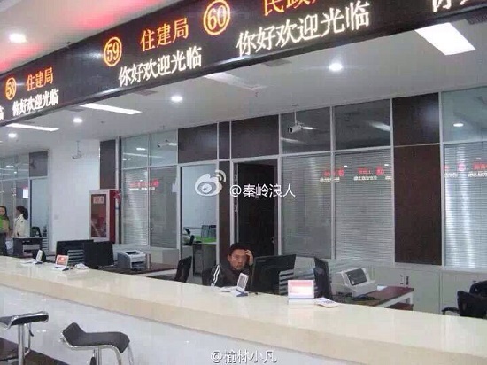 據(jù)該網(wǎng)友提供的照片顯示,在一政務(wù)大廳工作臺內(nèi)側(cè),有一名男子坐在電腦前操作電腦,其電腦屏幕上顯示的頁面類似一種網(wǎng)絡(luò)游戲畫面。