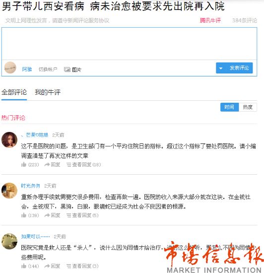 市場(chǎng)信息報(bào)10月30日以《家屬曝陜西中醫(yī)醫(yī)院折騰病人是為了套取國(guó)家醫(yī)?!窞轭},報(bào)道了陜西中醫(yī)醫(yī)院讓未治愈患者每隔15天重新辦理一次住院手續(xù),涉嫌套取國(guó)家醫(yī)保資金的違規(guī)行為,引發(fā)網(wǎng)絡(luò)熱議,有網(wǎng)友指出“重新辦理手續(xù)就需要交很多費(fèi)用,檢查再做一遍。醫(yī)院的收入來(lái)源大部分就在這塊……”對(duì)此,陜西中醫(yī)醫(yī)院回應(yīng),患者邱某系自費(fèi)患者,故報(bào)道失實(shí),并戲稱(chēng)“記者此前發(fā)布的陜西中醫(yī)醫(yī)院套醫(yī)保新聞,無(wú)大媒體轉(zhuǎn)載?!敝劣趫?bào)道失實(shí)之處,院方拒絕回答。