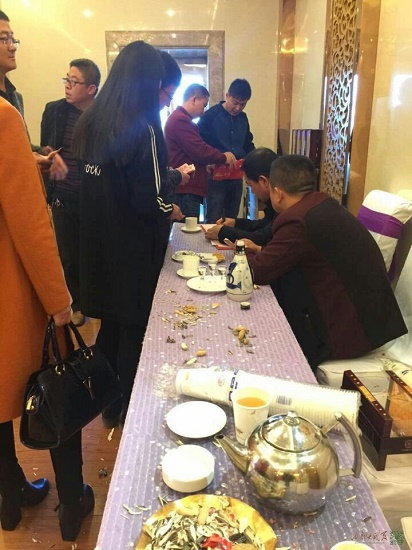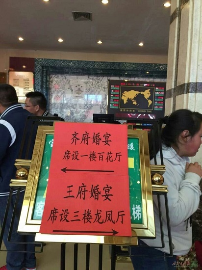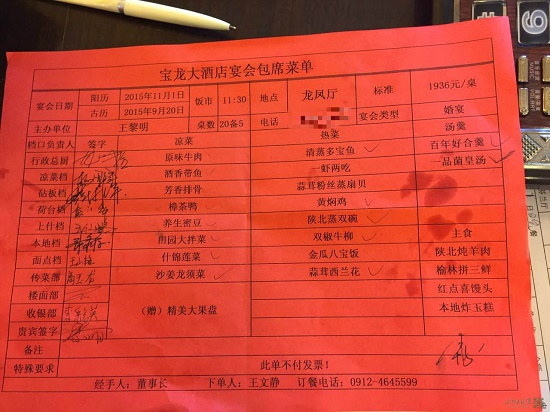 當(dāng)日中午11:30分,本中心工作人員來到該酒店3樓龍鳳廳,只見大廳人頭攢動(dòng),門口設(shè)有收禮臺,宴席共計(jì)28桌,每桌飯菜1936元,婚宴用酒為塞上榆林杏花酒,用煙為軟中華,經(jīng)了解,婚宴收禮共計(jì)94000元。