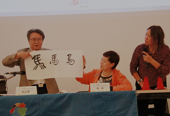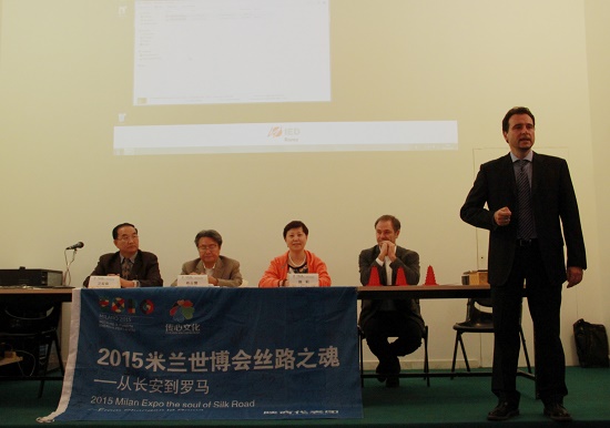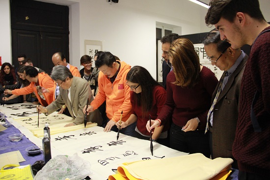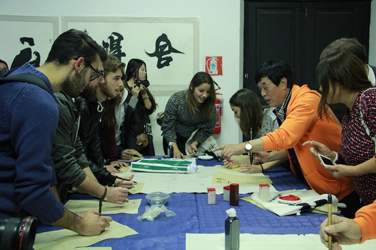 意大利時間2015年10月26日下午3點,“2015米蘭世博會絲路之魂—從長安到羅馬”陜西代表團團長陳莉女士、著名書法家肖云儒先生、衛(wèi)雙良先生、劉寧亞先生、辛建社先生、唐占魁先生、萬廣輝先生一行幾人走進歐洲設計學院進行一系列書法文化交流,開展書法講座,參觀院校并進行了現(xiàn)場書法展演。陜西著名書法家肖云儒和衛(wèi)雙良先生分別從“中國書畫美學特征”和“中國文字與書法”主題做了生動的演講,與師生們開展文化互動。在意大利國家電視臺特別顧問蓋特先生的主持下,歐洲設計學院羅馬分校校長AntonioVenece先生、意大利導演保羅先生、華人聶紅梅女士和歐洲設計學院師生等近百人均參加了此次活動。