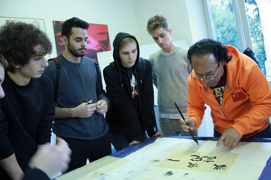 之后,中意雙方的朋友們參觀了布展中國代表性書畫作品的交流廳,六位書法家現(xiàn)場揮毫潑墨,用自己的藝術之筆向大家展示中國文字的魅力。圍觀的嘉賓和師生們聚精會神,不時的相互交流探討著其中的韻味。同學們還主動要求學習體驗,大師們都很耐心地為大家邊寫邊做描述。同學們興致勃勃地拿起筆來臨摹著,陶醉其中,還歡喜地收藏了自己學習的成果。