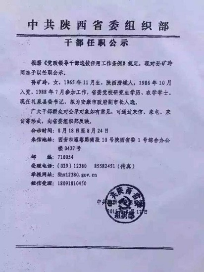 據2015年8月17日中共陜西省委組織部發(fā)布的一份干部任職公示文件顯示,孫礦玲現(xiàn)任禮泉縣委書記,擬為安康市政府副市長人選。公示時間為8月18日-8月24日。