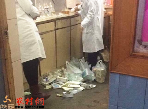 中醫(yī)醫(yī)院住院部一治療室內(nèi)醫(yī)護(hù)人員腳邊亂扔的醫(yī)藥盒