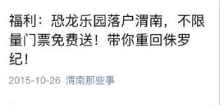 在售票處,記者發(fā)現(xiàn)有很多家長拿著手機(jī)在給售票的工作人員看,到底是在看什么呢?記者了解后得知,一部分家長是通過一個(gè)“渭南那些事”微信公共平臺(tái)上了解到此類信息。微信中稱,“2015年、10月31日,11月1日(僅展2天,風(fēng)雨不改,早上9:00--下午17:30),一大批恐龍?jiān)谖寄鲜薪?jīng)開區(qū)歡樂海水上娛樂世界“復(fù)活”啦!?。£P(guān)鍵是:不限量門票免費(fèi)送啊來多少送多少?。?!”“在這里,有各式各樣的恐龍:霸王龍、暴龍、翼龍、劍龍、三角龍等等”“渭南市經(jīng)開區(qū)歡樂海水上娛樂世界(辛市轉(zhuǎn)盤向西300米)——恐龍主題公園?!苯刂拱l(fā)稿時(shí)該信息的閱讀量已達(dá)四萬余次。