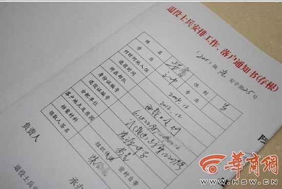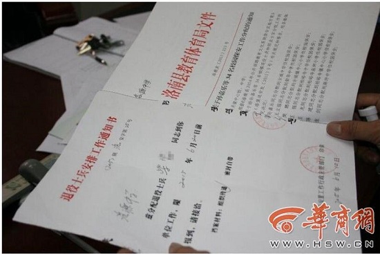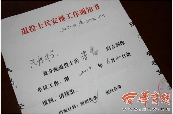 10月27日,華商報記者來到洛南縣洛源中學(xué),并未見到柴某本人,校方向記者提供的退役士兵安排工作通知書顯示:茲分配退役士兵柴某同志到洛源中學(xué)工作,限2015年6月20日前報到,請洛塬中學(xué)接洽。落款公章為洛南縣復(fù)員退伍軍人安置辦公室,日期為2015年6月20日。