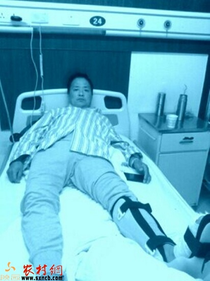 2015年10月23日中午,記者來(lái)到位于文林路上的延安大學(xué)咸陽(yáng)醫(yī)院(二十局醫(yī)院),見(jiàn)到了求助的42歲西郭村村民的張鋒,此時(shí),張鋒正躺在床上,左腳兩處嚴(yán)重骨折剛做完手術(shù)。說(shuō)到被打的事情,張峰一臉的委屈。他說(shuō)最近他的侄子在離村子不遠(yuǎn)的工地里承包了工程,他便在那里打工,可在施工過(guò)程時(shí),村支書(shū)張某帶人在工地阻擋,迫使工地施工時(shí)常終斷。