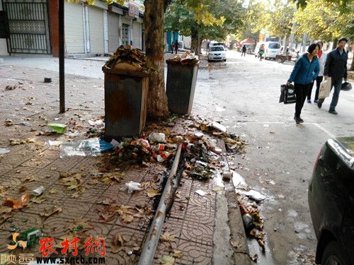 更令人不可思議的是:零口街道辦的大門口的一角,放著2個(gè)綠色的垃圾箱,在垃圾箱周圍,卻是灑落滿地皆垃圾的凌亂景象。從零口街道辦向西而行,每50米就是1攤垃圾,而且垃圾遍布的距離絕對是標(biāo)準(zhǔn)化的。