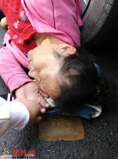 騎自行車的婦女被出租車撞倒后,倒在出租車的輪胎旁的婦女痛苦不堪,并不斷地呻吟著
