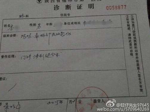 14日下午,發(fā)布此消息的當(dāng)事人李某告訴九派新聞?dòng)浾撸?015年7月18日凌晨1點(diǎn)左右,他和朋友姬某在榆林某KTV玩,隨后遭到樊某和賈某等四、五個(gè)人毆打。李某指稱(chēng)樊某是榆林市城市管理綜合執(zhí)法局某分局執(zhí)法員。