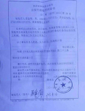 神木縣公安局對屈金有的《行政處罰決定書》