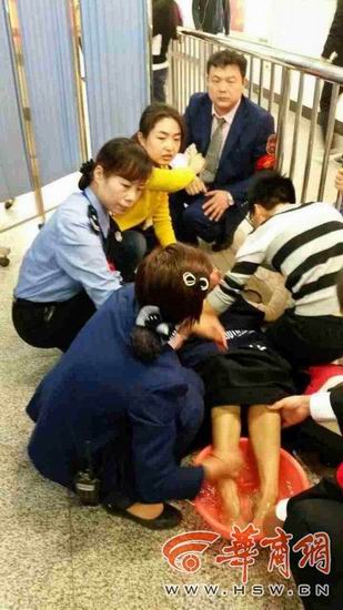 10月7日,西安地鐵一號(hào)線后衛(wèi)寨站一名乘客暈倒,一名路過(guò)護(hù)士用熱水幫其按摩腳部,搶救病人。