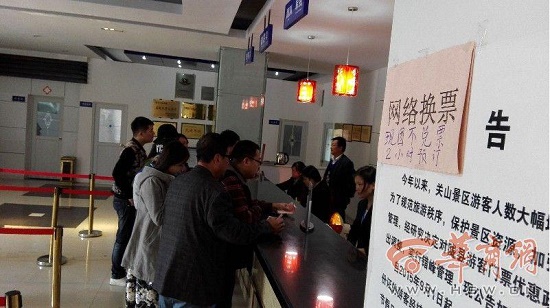 當(dāng)日12時(shí)許,華商報(bào)記者來到關(guān)山牧場景區(qū),售票大廳里購票的游客并不是很多,在網(wǎng)絡(luò)售票窗口一張網(wǎng)絡(luò)換票的標(biāo)牌上,臨時(shí)加上了“現(xiàn)團(tuán)不兌票,2小時(shí)預(yù)訂”的文字。陜西關(guān)山草原旅游發(fā)展公司一名知情人士稱,團(tuán)購優(yōu)惠價(jià)主要用于非重大節(jié)假日期間吸引游客,而十一黃金周期間游客較多,不愁客源,如果實(shí)行優(yōu)惠價(jià)的話,會給公司造成很大的經(jīng)濟(jì)損失,所以公司鼓勵(lì)員工勸導(dǎo)游客現(xiàn)金購票。