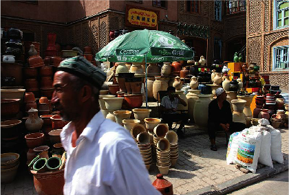 在阿克蘇到喀什的綠皮火車上,一個(gè)老新疆告訴記者:買紀(jì)念品就去東門大巴扎,那里價(jià)格實(shí)在。但去了之后卻很失望,號(hào)稱上千年歷史的國(guó)際大巴扎,就是一個(gè)大型批發(fā)市場(chǎng)。