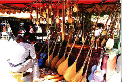 還有一條街,是坎土曼巴扎街。令人驚訝的是,這里出售的坎土曼,正面還淺淺地刻著好幾種圖案。也有打馕必用的長(zhǎng)鐵鉤—將烤熟的馕從爐子里取出時(shí)用的一種工具,烤肉用的鐵簽子??κ驳蔫F匠,無(wú)論加工鐵鍋、鐵勺,還是刀劍、長(zhǎng)矛,常常是從廢鐵中選材,扔進(jìn)鐵爐燒紅,打制直到成型。