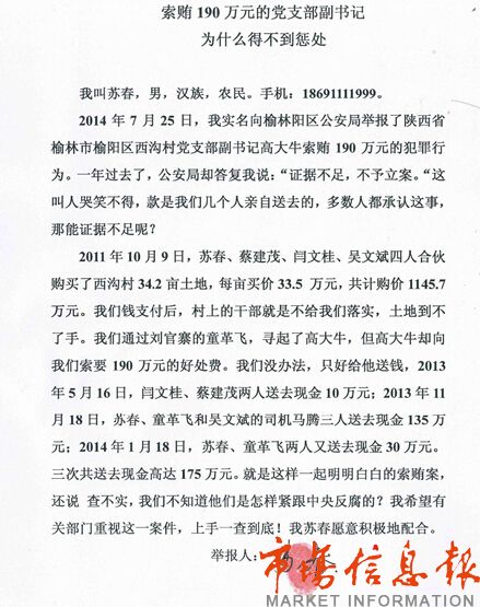 2015年9月28日,陜西榆林榆陽區(qū)西溝村村民蘇春發(fā)帖稱:榆林市榆陽區(qū)西溝村黨支部副書記高大牛向其索賄190萬,卻得不到懲處。本報記者聯(lián)系了蘇春,蘇春表示,自己所發(fā)內(nèi)容絕對屬實,報案后,榆陽區(qū)公安局一直拖著,3個多月還未處理。西溝村黨支部高副書記表示發(fā)帖人提到的175萬元交給了賣地的人,和自己無關。