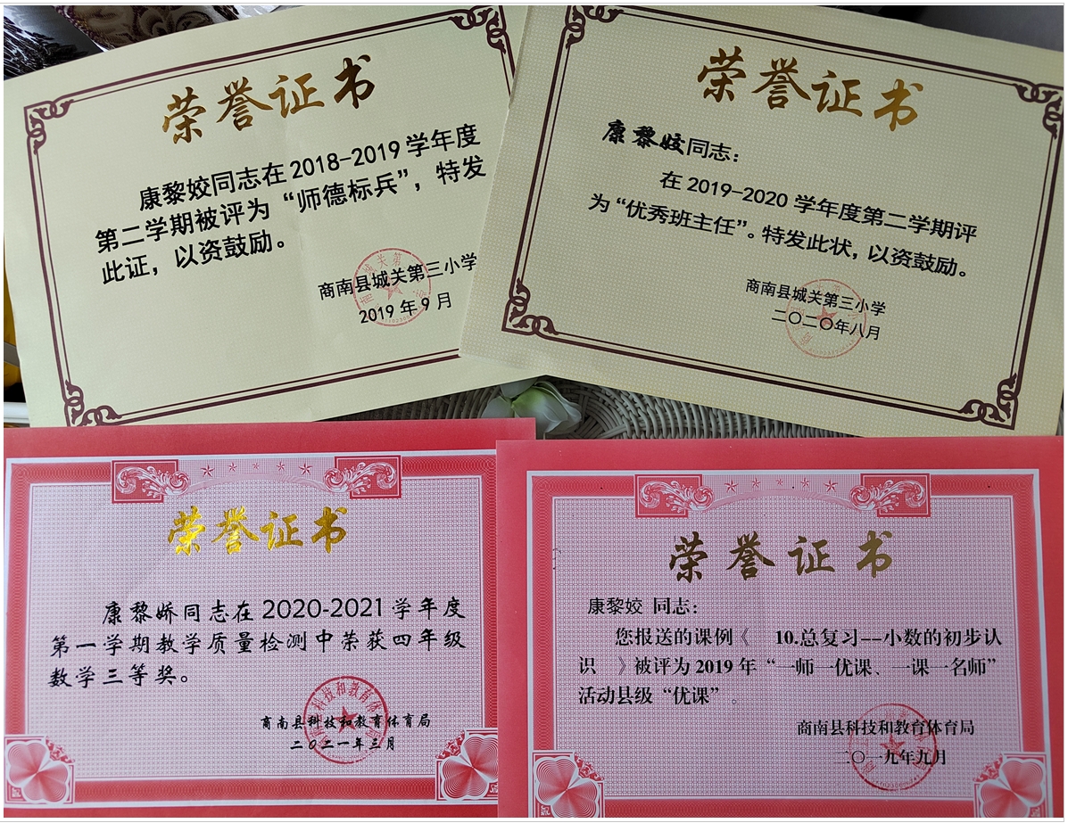康老師堅信“一份耕耘,一份收獲”。在做好日常教學(xué)工作的同時,她積極培養(yǎng)學(xué)生課外興趣和愛好,組織和指導(dǎo)學(xué)生參加各類競賽,校藝術(shù)節(jié)活動中指導(dǎo)學(xué)生作品也取得了較好的成績。不積跬步無以至千里,正因她的不懈努力,2018-2019學(xué)年度被評為校級“師德標(biāo)兵”,2019-2020學(xué)年度被評為校級“優(yōu)秀班主任”,2019年報送的課例被評為“一師一優(yōu)課、一課一名師”縣級優(yōu)課,,2020年全省第十五次優(yōu)秀教科研論文與成果交流評選榮獲三等獎,2020-2021學(xué)年度質(zhì)量檢測縣級三等獎,2021年榮獲“商南縣德育工作先進(jìn)個人”,2023年在商南縣中層業(yè)務(wù)能力大賽中榮獲二等獎。